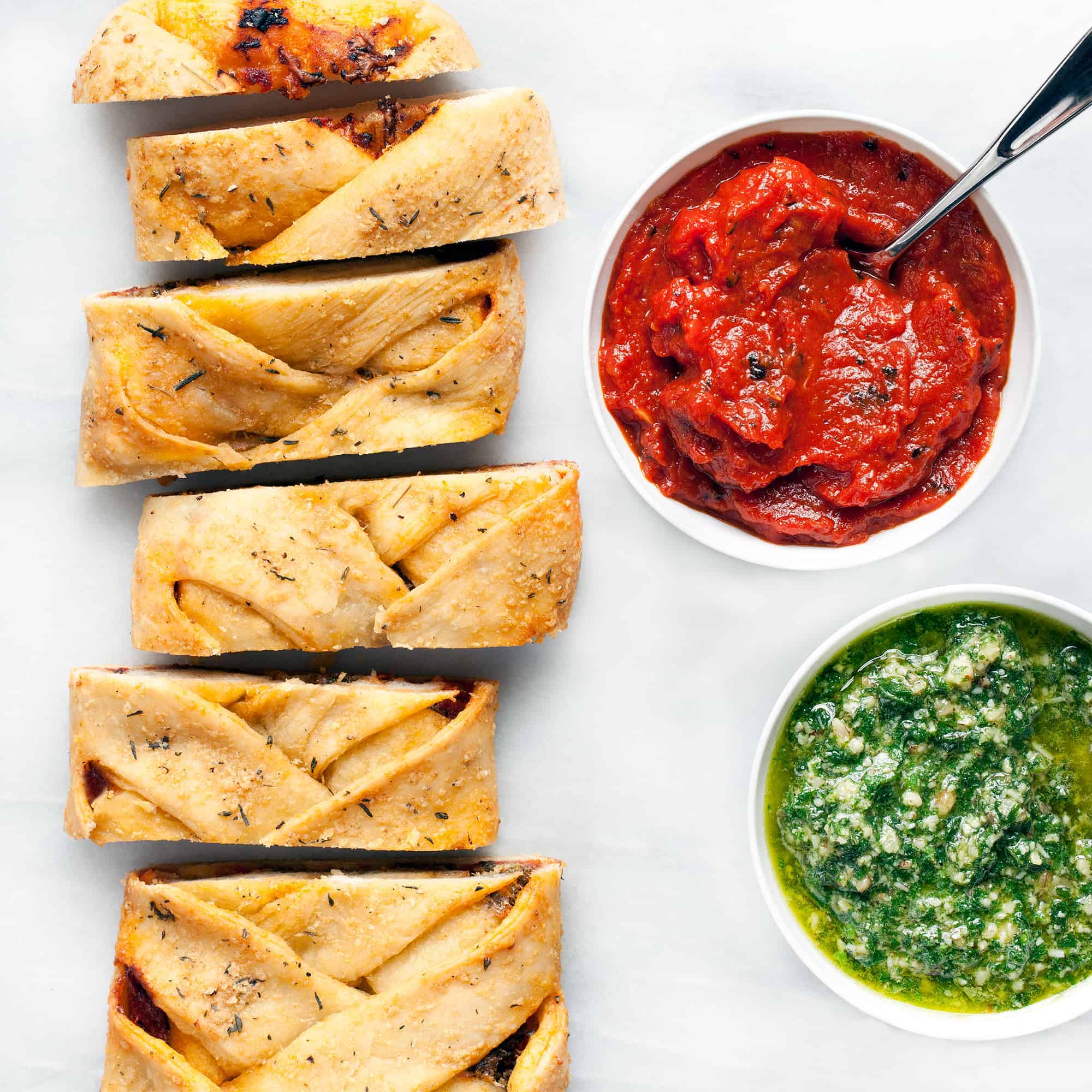 Even though this pizza bread has sauce inside of it, I like to serve it with more dips on the side. Tomato sauce and pesto are my favorites, but ranch would be another good option.