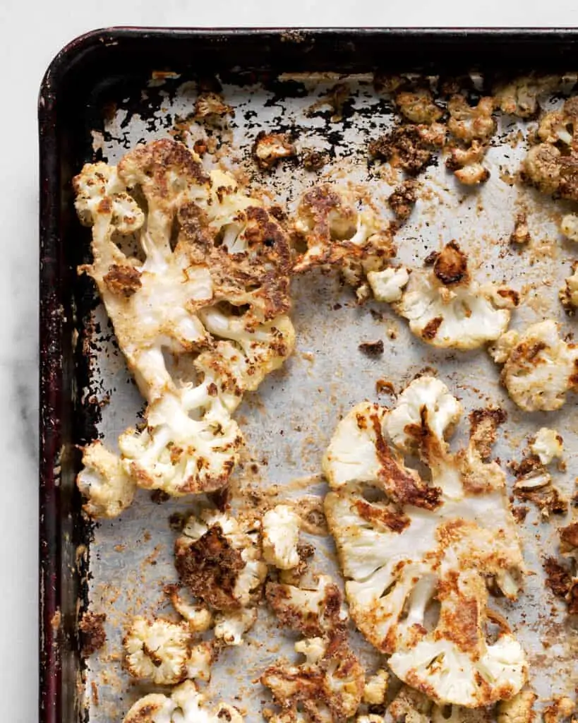 Make sure to slice the cauliflower as noted in the recipe. Less cauliflower will go to waste than if you break it into florets with your hands. Also, those flat sides will make more contact with the hot metal of the pan, which maximizes browning. And you should arrange the cauliflower in a single layer without overlapping.