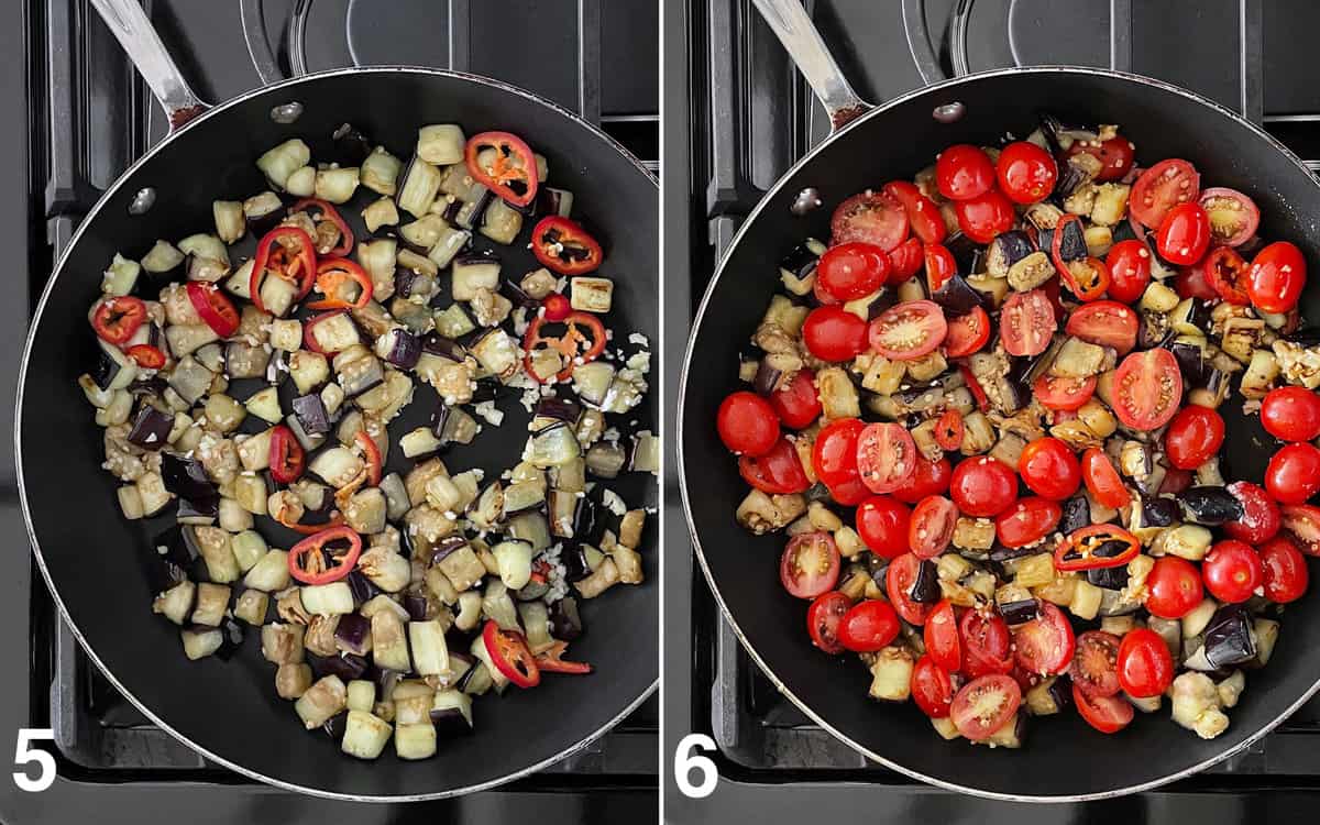 - Don’t crowd the pan. You’ll see that I sauté half the eggplant and then cook the other half. That’s because I don’t want my pan so full on that initial sauté that the eggplant steams instead of browning. It’s important to cook it in batches.
