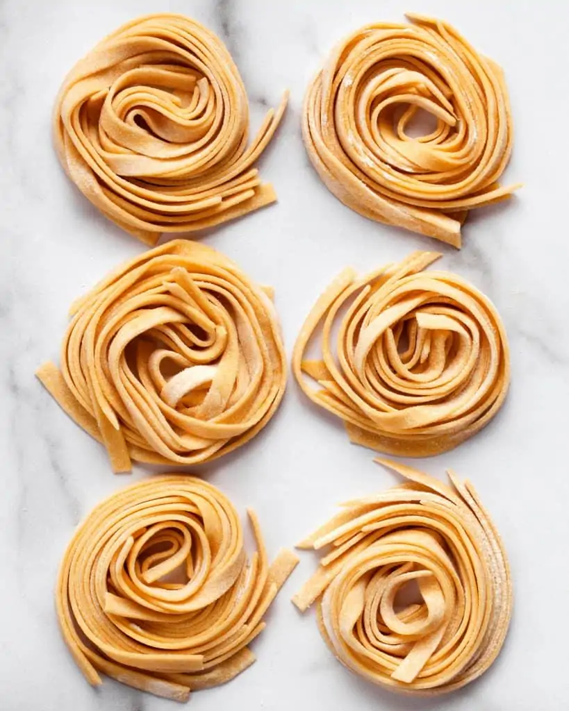 - Sprinkle the sheets with flour and roll them up loosely. Using a knife, trim the rough edges and cut into 1/4-inch wide strips. Unroll and place the strips on a floured sheet pan. Repeat with the remaining dough.