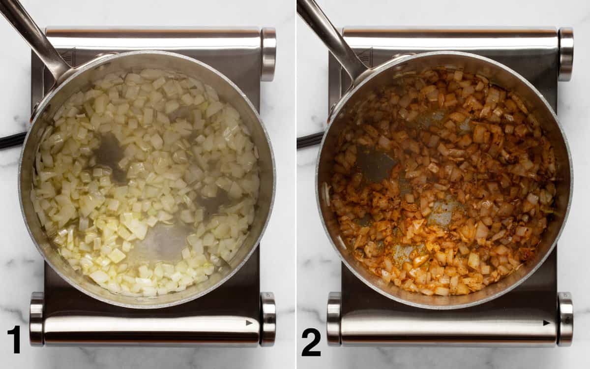 - Heat the oil in a large saucepan over medium-high heat. Add the onions and sauté for 4 minutes until they start to soften and turn translucent.