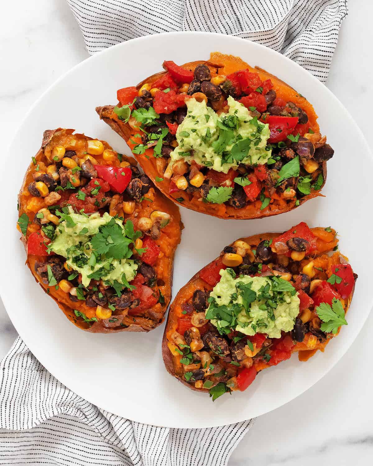 If you’re looking for a vegan dinner that’s filling with lots of vegetables and beans, these baked sweet potatoes tick all the boxes. It’s a win whenever I can transform potatoes from a side dish to a main dish. This recipe eats like wholesome comfort food.