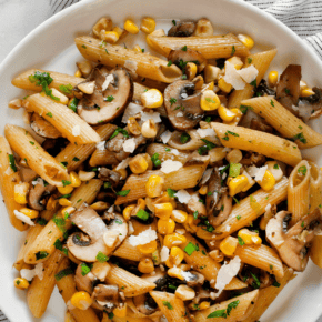 Corn and mushrooms pair so well together. I love the earthy mellow flavor of mushrooms with corn. By adding pasta, you turn what could be a vegetable side dish into a full-fledged main course.