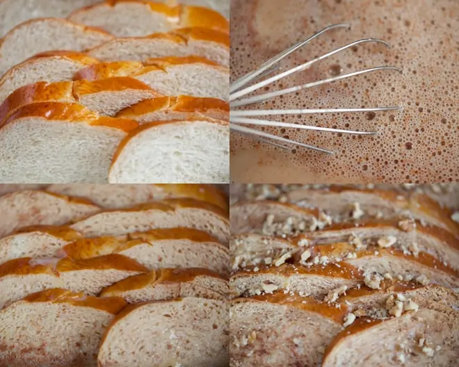 - To bake, preheat the oven to 350 degrees F. Remove the baking dish from the refrigerator. Use a spoon to scoop up the unabsorbed liquid and baste the tops of the bread slices. Bake for 30 minutes. Sprinkle the walnuts on top and bake for an additional 10 minutes.