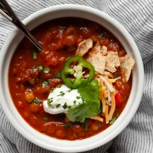 As mentioned, this chili recipe is vegan. It is what you end up topping your chili with that can change that. Look for vegan or dairy-free versions if that’s your dietary preference: