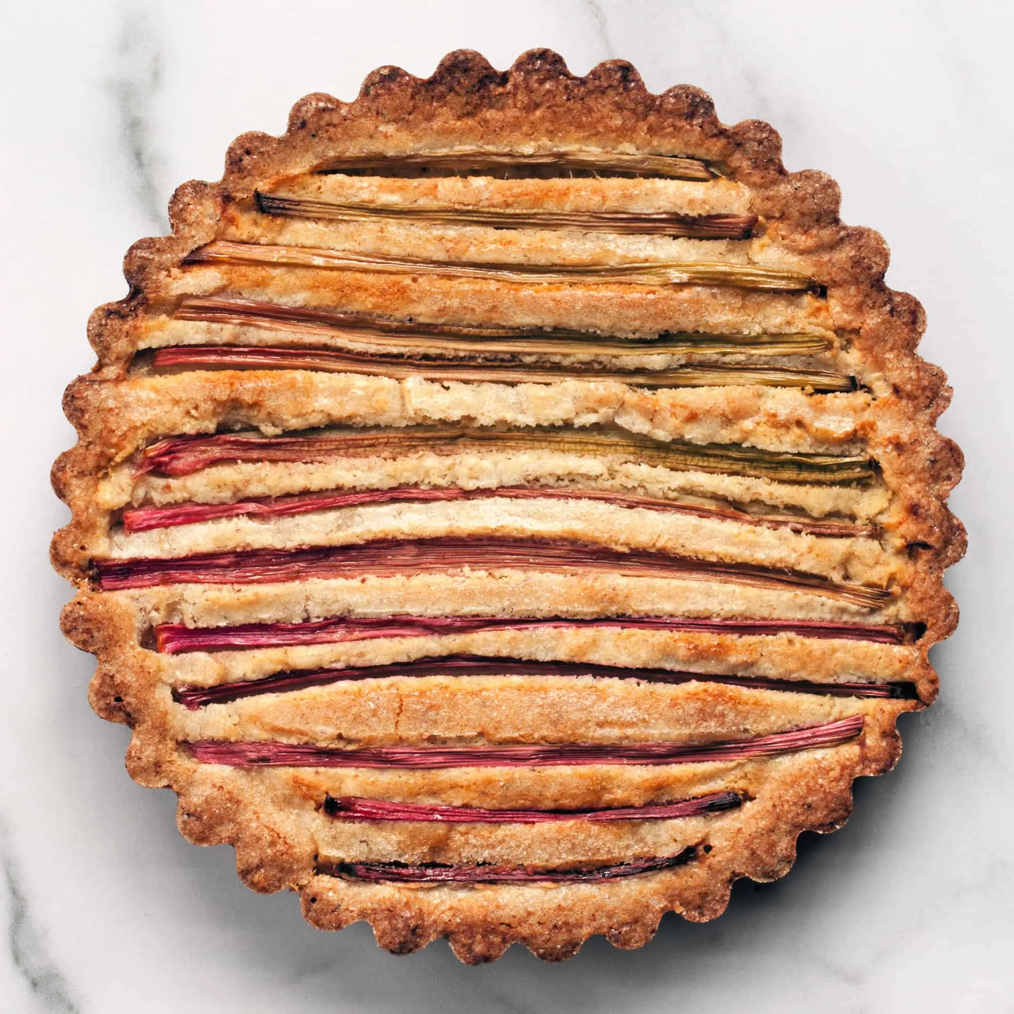 There is a secret layer of chopped rhubarb inside this rhubarb almond cake. Baking the cake in a tart pan gives it beautiful and effortless ruffled edges that look fancy.