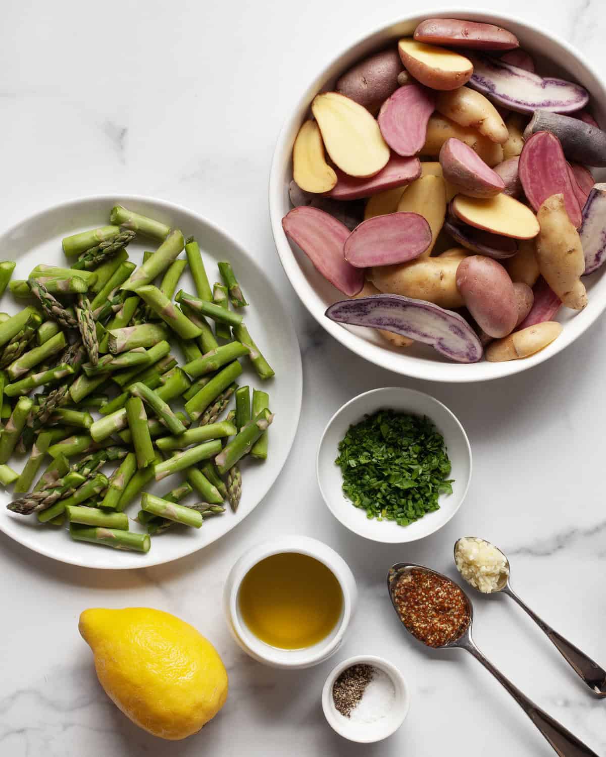 3. Make the vinaigrette. Whisk together the garlic, mustard, parsley, chives, salt, pepper, lemon juice and oil in a bowl big enough for the potatoes and asparagus.