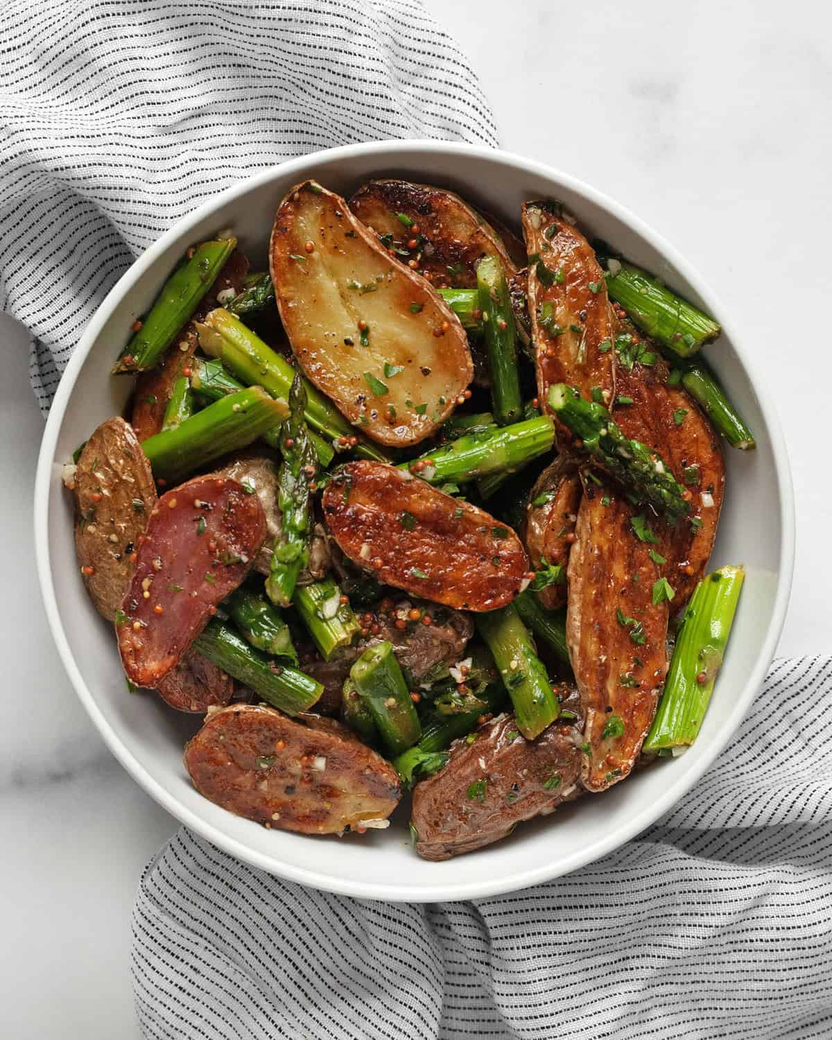4. Stir the roasted potatoes and asparagus into the dressing. Sprinkle with more fresh herbs before serving.