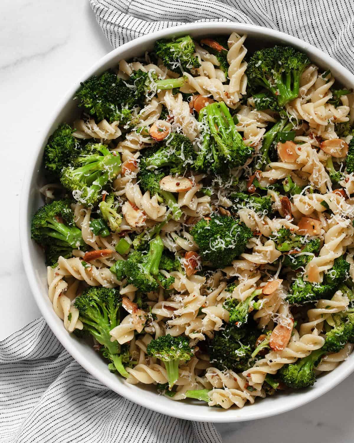 - Combine the pasta, roasted broccoli, scallions, parmesan, almonds and parsley in a large bowl. Drizzle in the dressing and toss to combine.