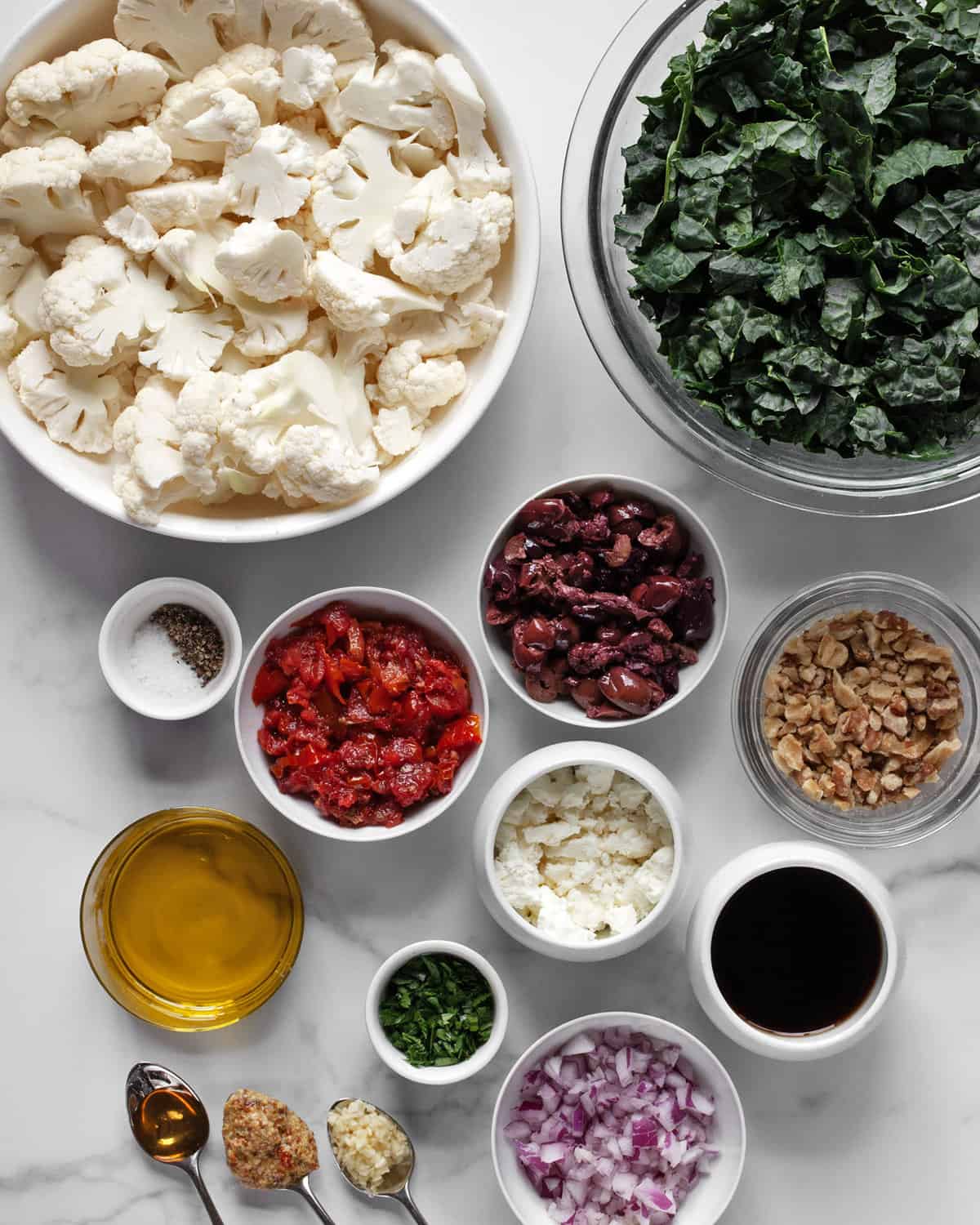 - To assemble the salad, combine the kale, cauliflower, onions, tomatoes, olives, feta, walnuts and parsley. Drizzle in the dressing and toss to combine.