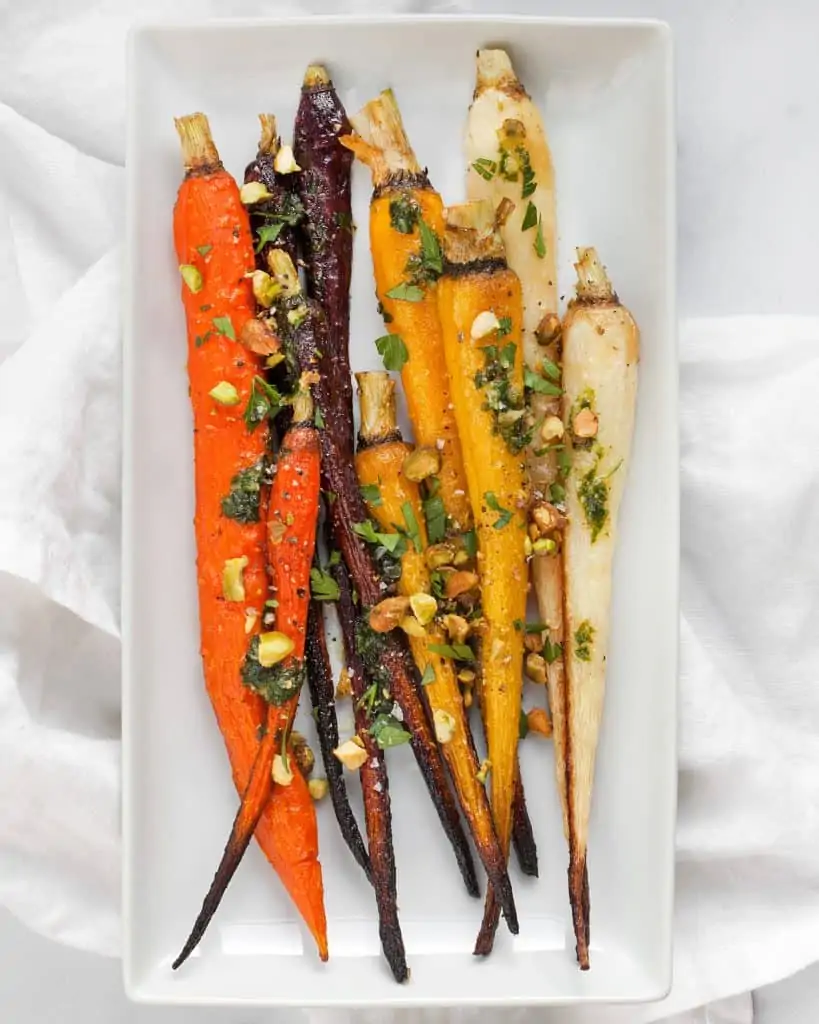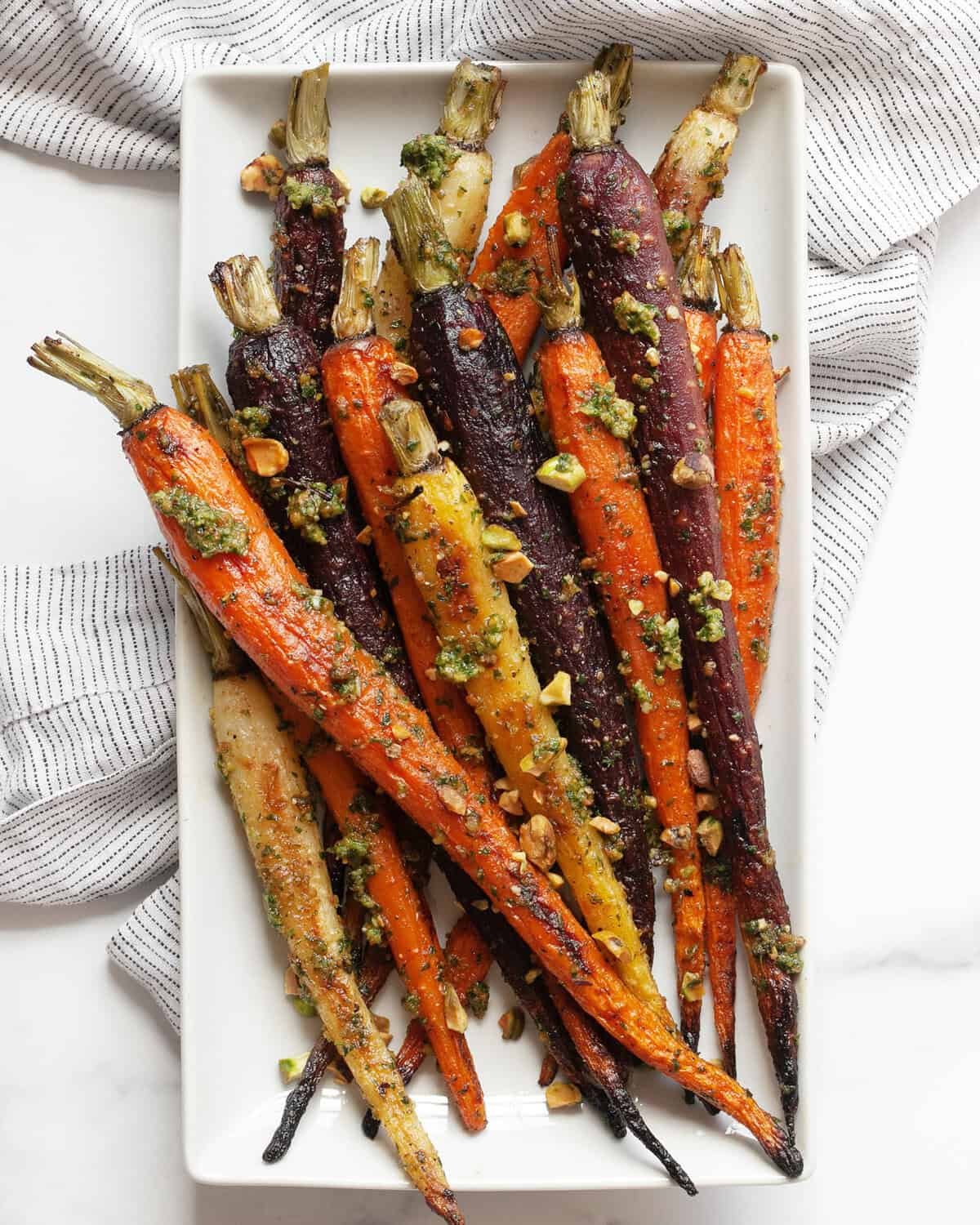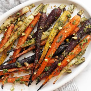 Tossed with carrot top pesto, these roasted rainbow carrots are a colorful and easy vegetable side dish. They are approachable for a weeknight dinner while also being exciting enough for a holiday meal. I quickly marinate the carrots with honey, cumin and olive oil before roasting them. While the carrots are in the oven, I make the pesto with a handful of the leafy carrot tops plus parsley, pistachios and parmesan.