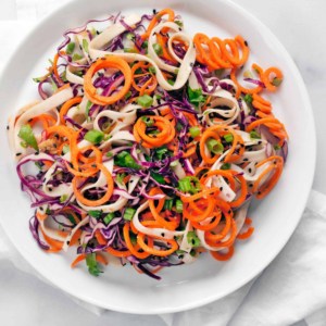 Heavy on carrots and red cabbage and light on the udon noodles, the ratio for these sesame ginger noodles is deliberate for a fresh, crunchy vegan dish.