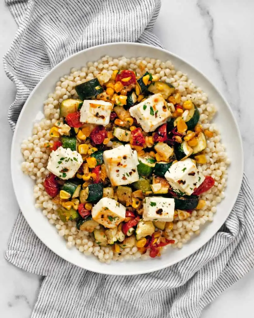 You can keep things simple and serve this baked feta and veggies with pearl couscous, farro or rice. I like something with a plumper grain. This is such a great way to turn feta, zucchini, corn and tomatoes into a vegetarian main dish.