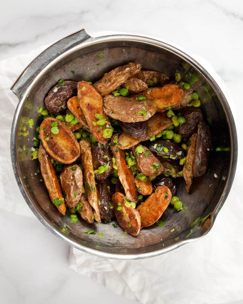 - White the potatoes are roasting, simmer the frozen peas in salted boiling water until cooked through, about 2-3 minutes.