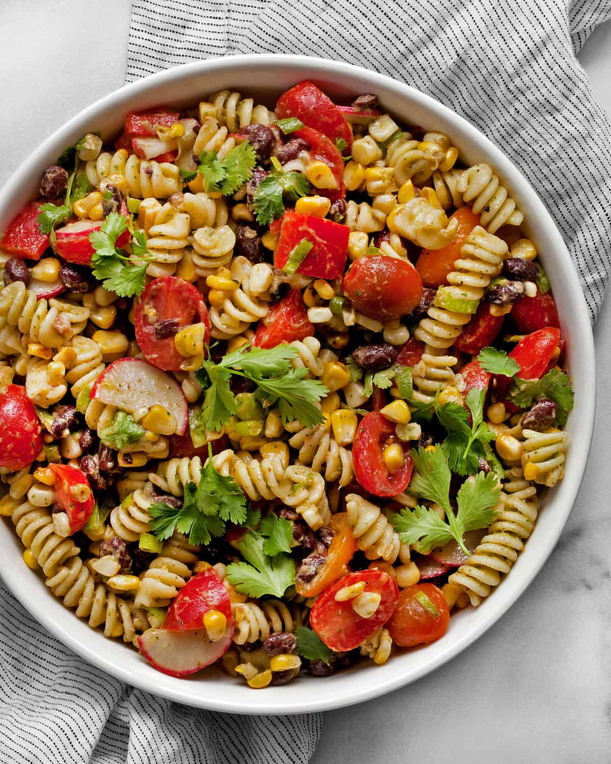 The flavors are different than the usual pasta salad. Naturally pasta dishes, including salads, tend to have vegetables and other ingredients that are Italian or Mediterranean. With black beans, corn and radishes, this recipe is a great way to change up your pasta salad game.