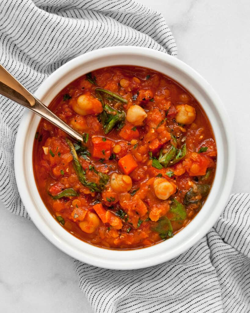 Smoked paprika gives this red lentil soup recipe a zesty kick. It has chickpeas, carrots and spinach. Add it to your list of healthy comfort food that’s vegan and freezer friendly along with Hearty Vegetable Soup, Chile Verde with White Beans and Black Bean Chili.