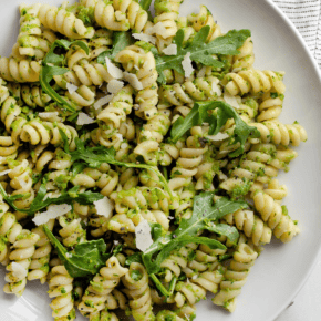 - Pasta: You can use any noodle, but my preferences are penne with its ridges and fusilli or rotini with their corkscrews because they almost grab on to the pesto.