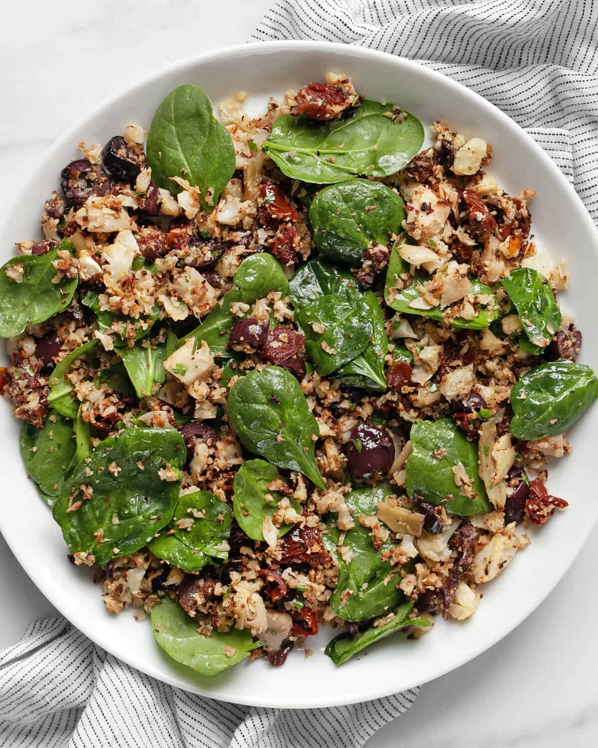 If you’re a fan of cauliflower rice, you have to try roasting it instead of sautéing it on the stove. Roasted cauliflower rice has so much more flavor thanks to all those browned and caramelized grains. In this easy recipe, I fold in sun dried tomatoes, kalamata olives, artichokes and spinach for a Mediterranean twist. Vegan and gluten-free, roasted cauliflower rice makes a healthy side dish or a satisfying main.