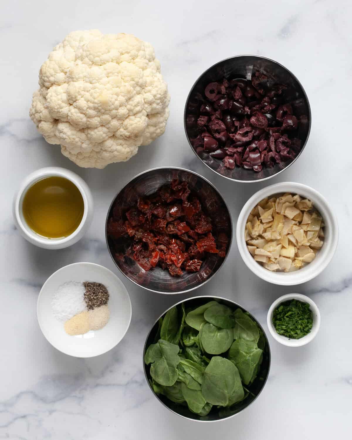 Roasted cauliflower has a mild flavor that works with lots of different vegetables. You can make the recipe as written with sun dried tomatoes, olives and artichokes or try one or more of these suggestions.